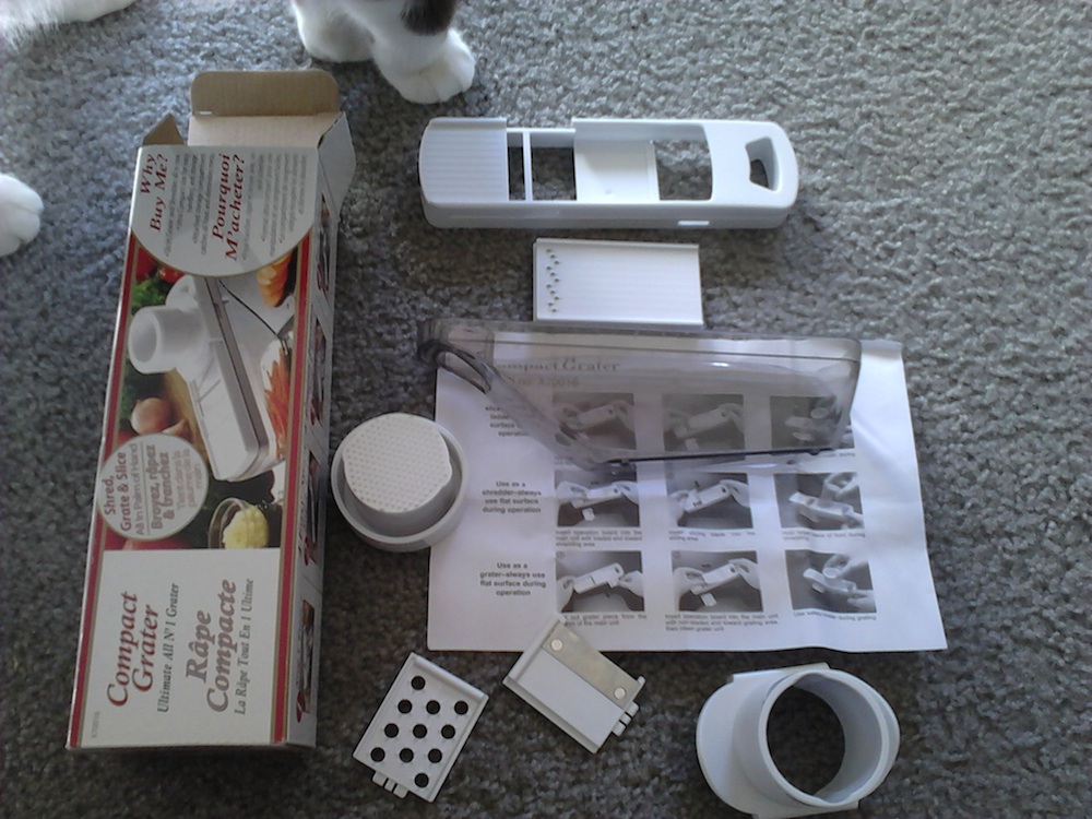 Sep. 7th, 2014 09:06 amYesterday was a big yard sale day around here, so off we went to brave the heat and humidity. I was feeling very kitchen-y, so of course I grabbed up this nifty slicer/grater/shredder. (Just one dollar!) Then I got it home and took it out of the box.